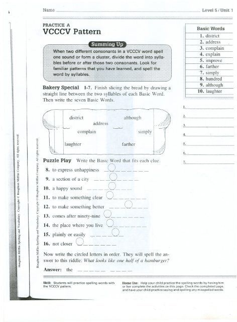 Syllables VCCCV Directions Choose the word in with the VCCCV syllable pattern to finish each sentence. 332a466e1cpdf - Read File Online - Report Abuse. Printable worksheets and activities.